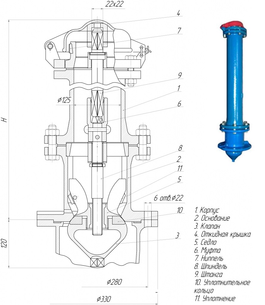 | Пожарный Гидрант Н-500 | 500 | 125 | 1 МПа | 15 | 65 |